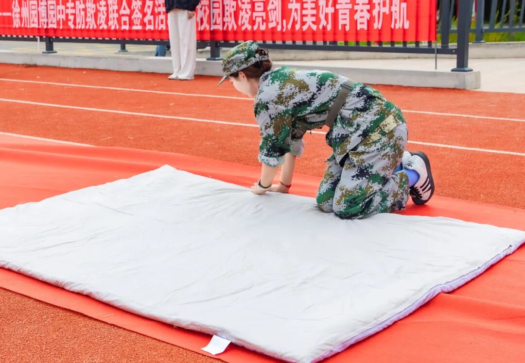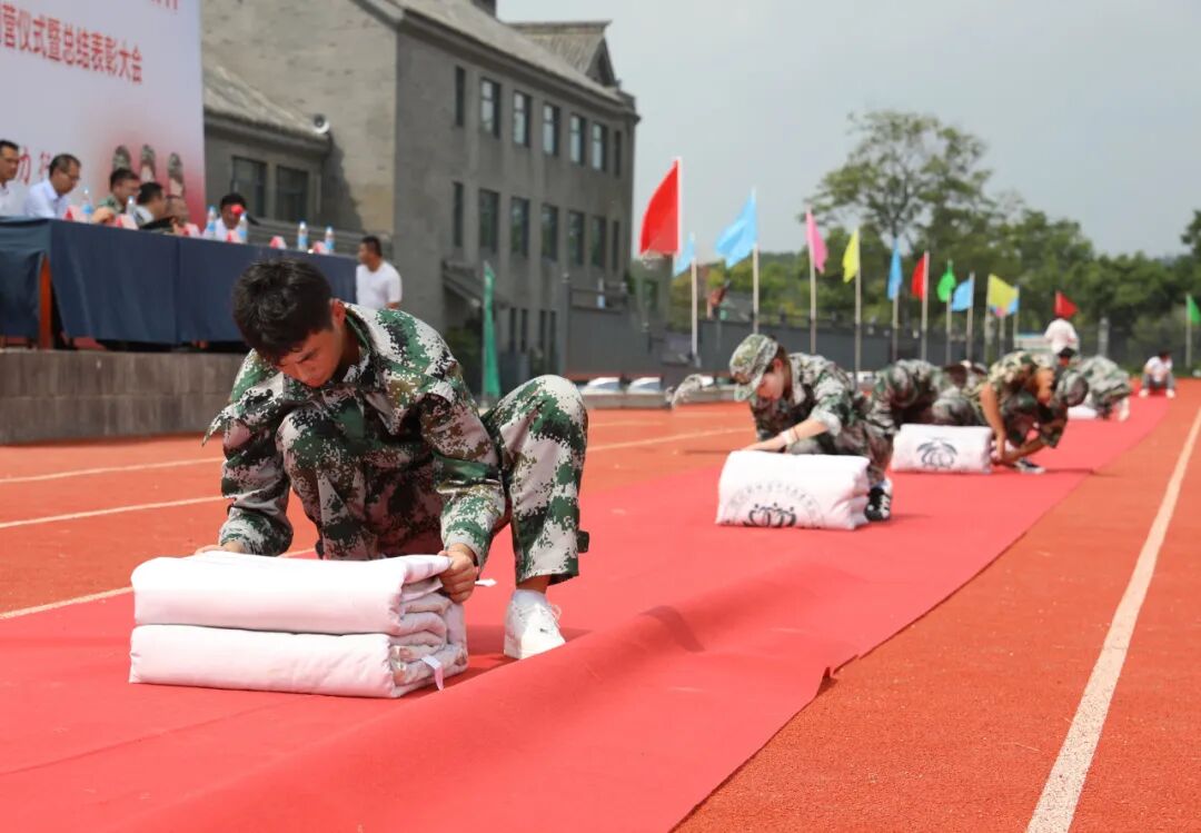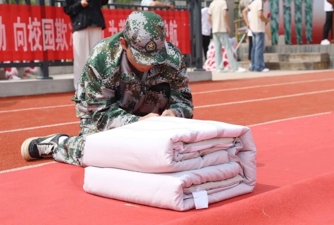 内务展示环节,新生结合日常经验与军训所学,通过展、折、跪、提、捏、修等连贯规范动作,将被褥精准叠成“豆腐块”形态。每一个完美的“豆腐块”背后,都凝聚着同学们在军训期间的刻苦练习和辛勤汗水。
